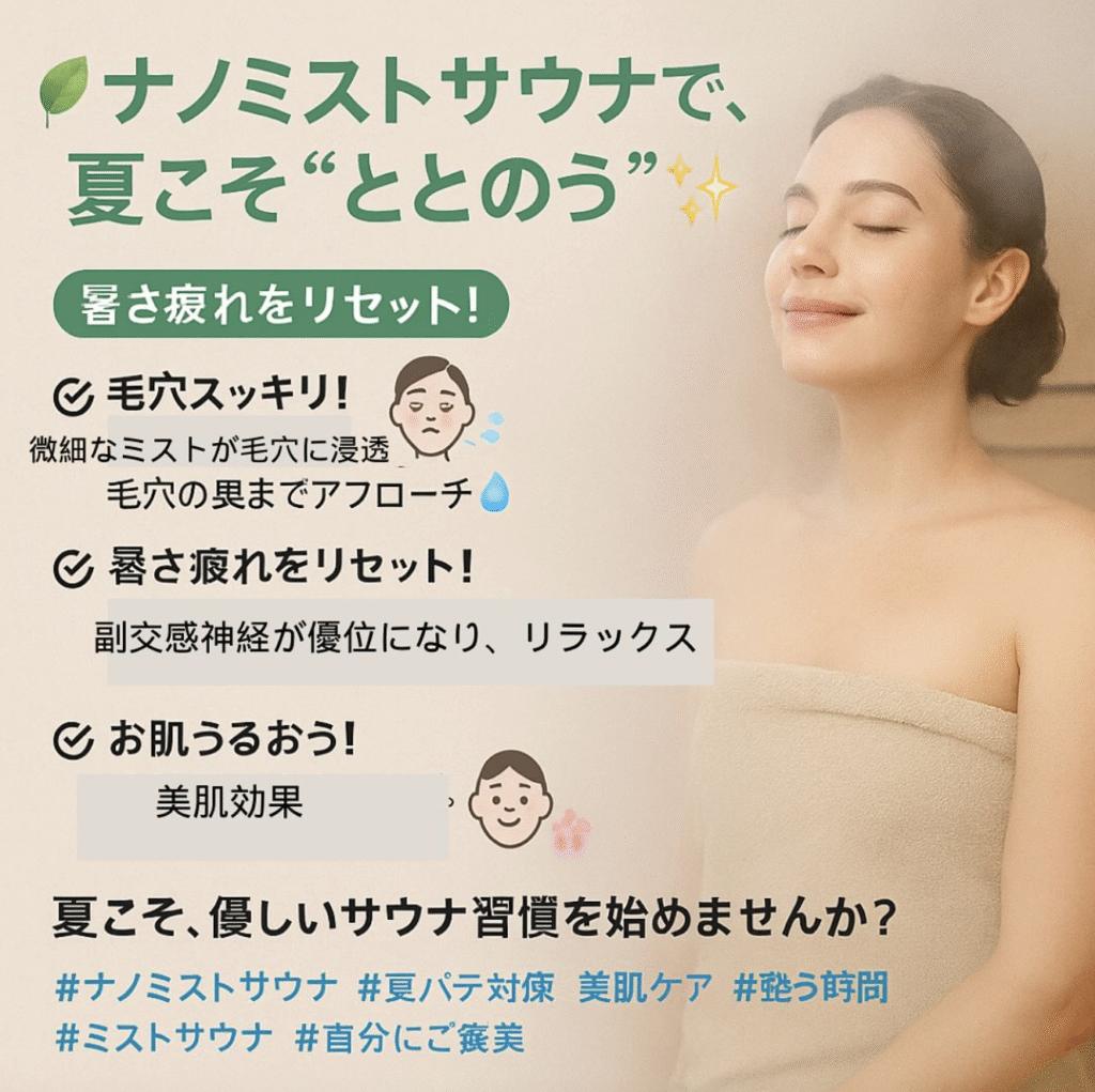ナノミストは通常のドライサウナより身体への負担が少ないため、毎日のリフレッシュにも最適です◎