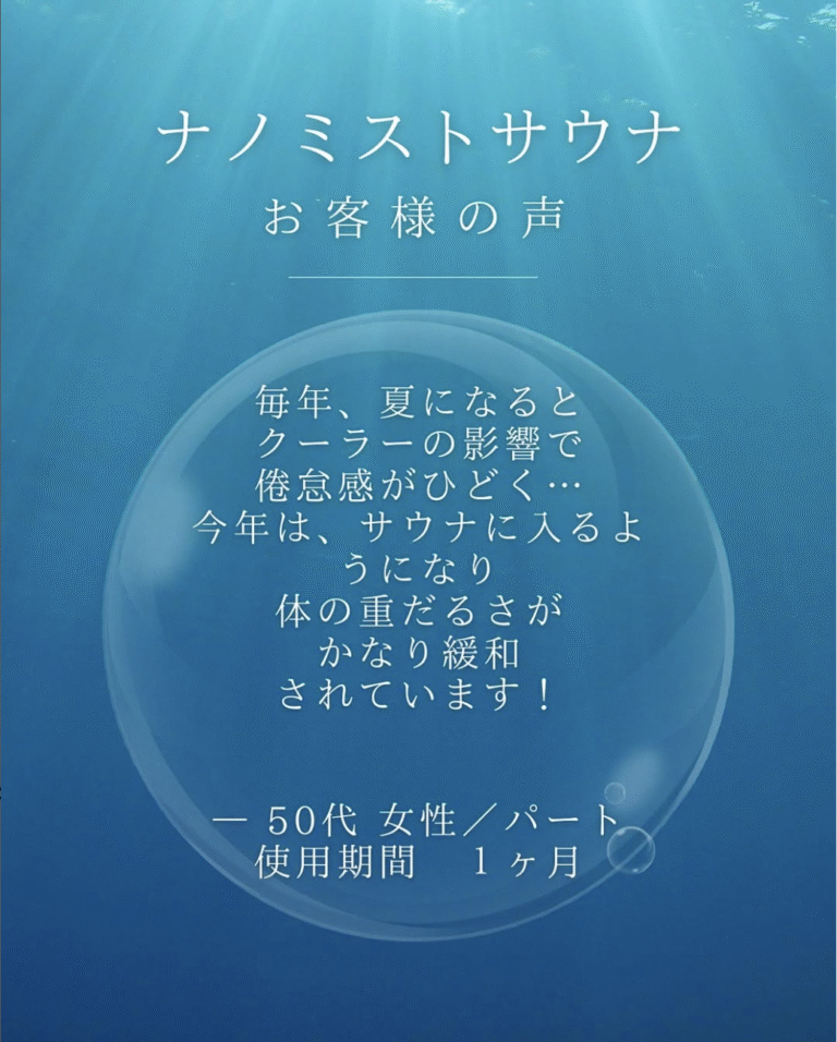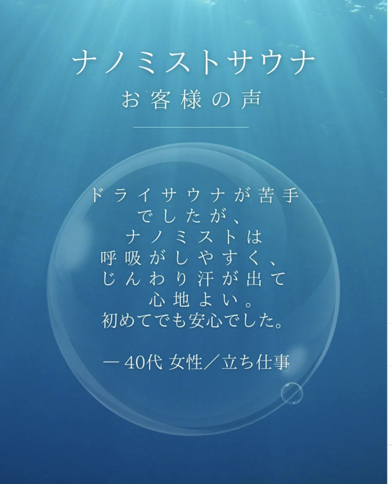 🚿ナノミストサウナ🚿お客様の声 普段立ち仕事で足のむくみや疲れが取れず、サウナが良いと聞いても、ドライサウナの「息苦しさ」と「暑さ」が苦手でした。 「ナノミストってどうなんだろう…?」と、半信半疑で体…